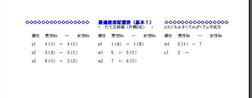 このように、微妙に組み合わせの仕様の異なる座席配置を基本1~13まで全て計算しておき、その時の投票率や中間時のカップル数などで自動判定し、基本1~13の中から最適座席配置表が決定されます。